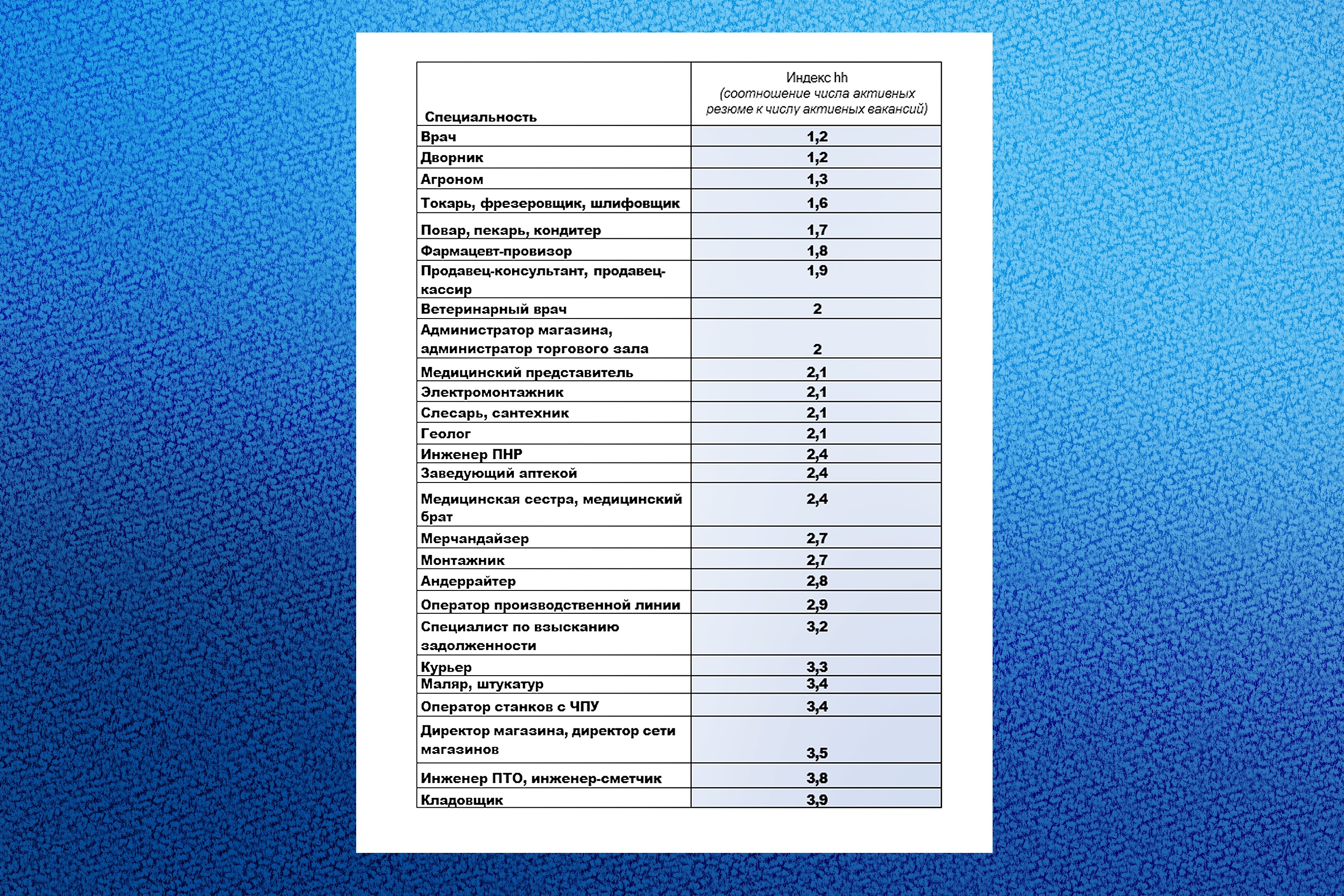 Однако за общей благополучной статистикой скрывается серьезный структурный перекос. В 27 профессиональных нишах наблюдается выраженный дефицит кадров: количество активных резюме значительно ниже числа открытых вакансий. В зоне особого дефицита (менее двух кандидатов на позицию) оказались врачи и дворники (по 1,2 резюме на вакансию), агрономы (1,3), токари (1,6), повара (1,7) и фармацевты-провизоры (1,8).