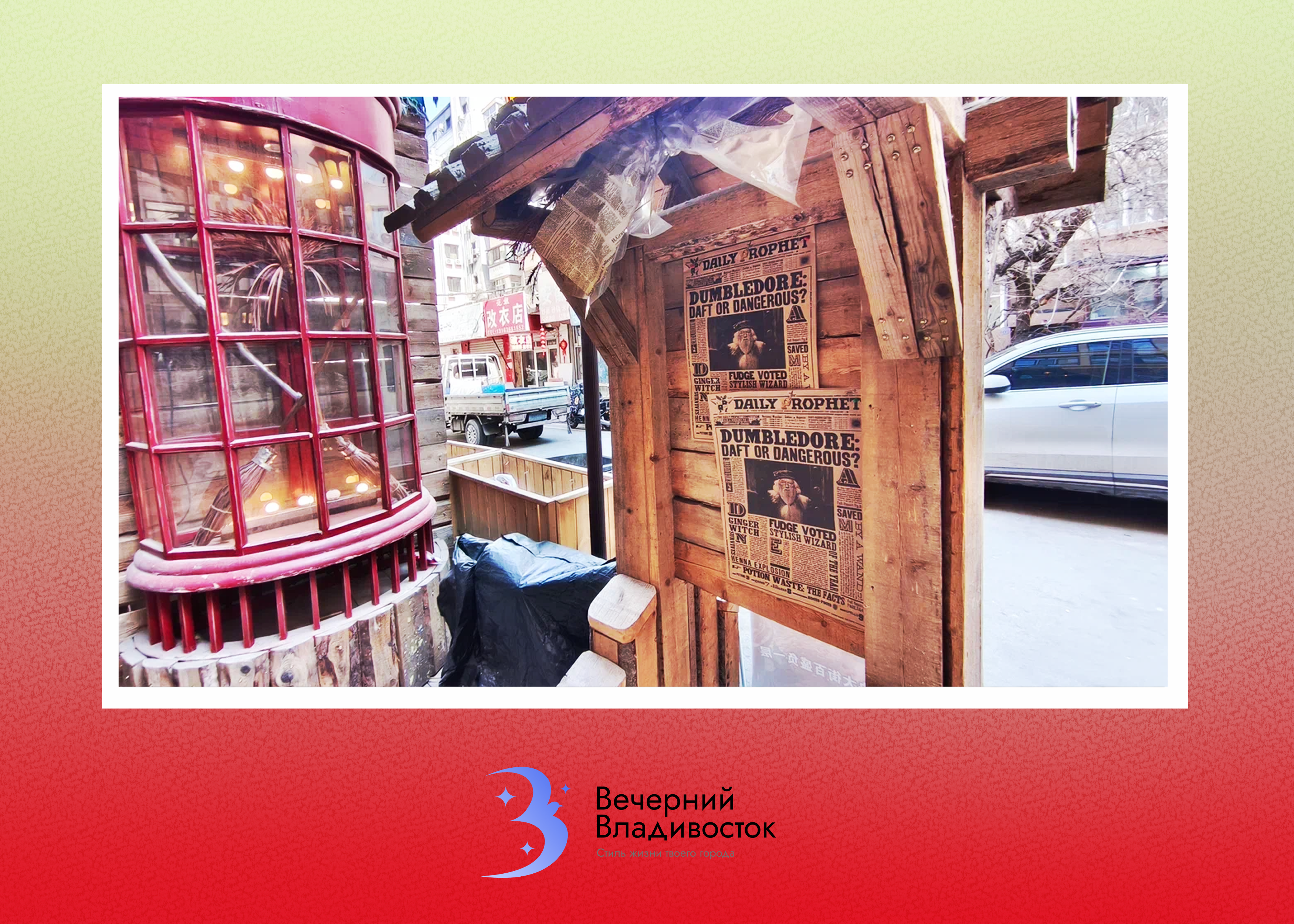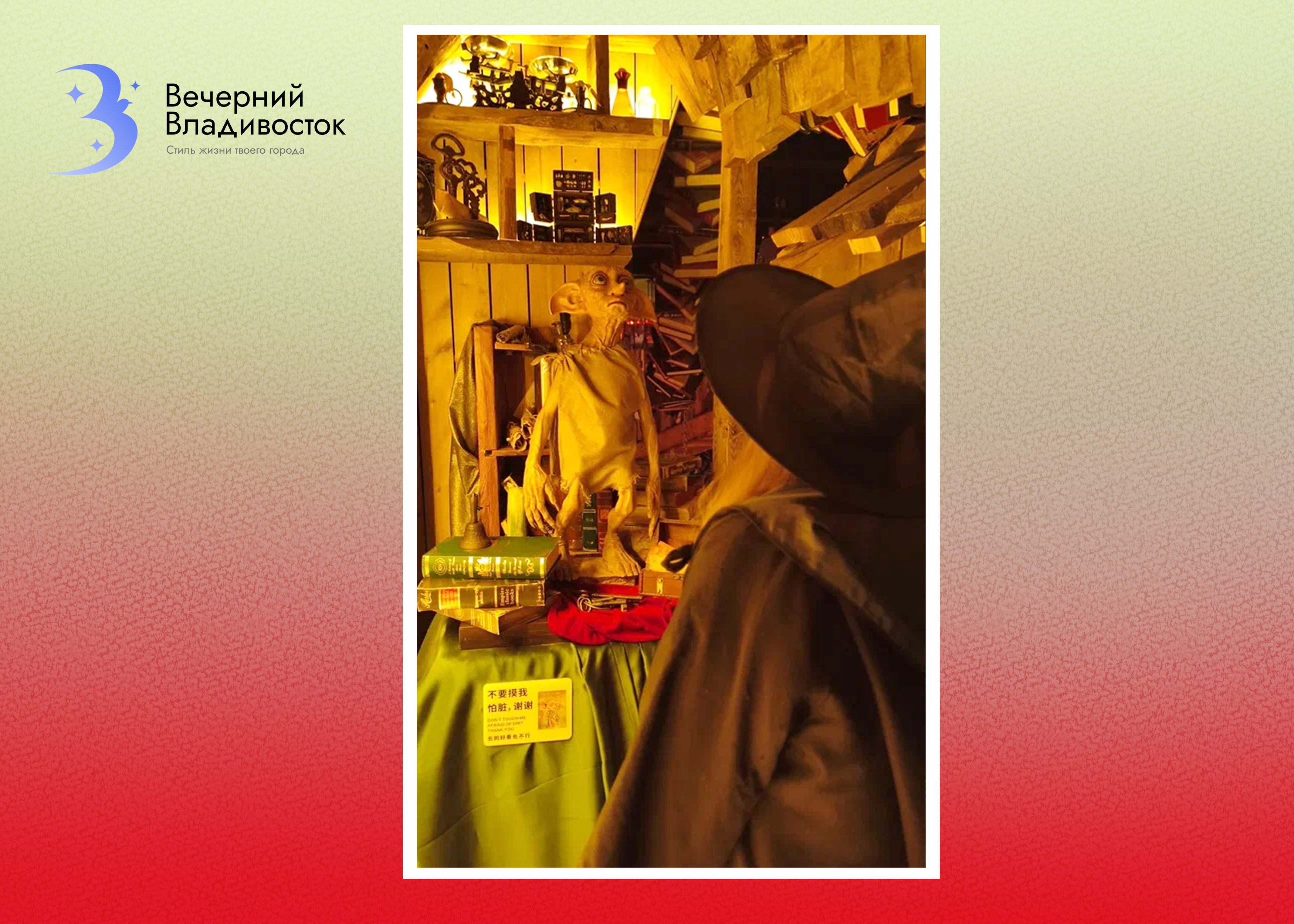 Неподалёку от центральной пешеходной улицы, свернув во двор, можно изрядно удивиться. В фасад обычной пятиэтажки как будто врос замковый фасад, отсылающий то ли к «Властелину колец», то ли к вселенной Гарри Поттера. Заприметив мётлы и знакомые черты лица бородатого старца на столбе для объявлений, мы поняли: это царство Джоан Роулинг. И непременно решили зайти внутрь.