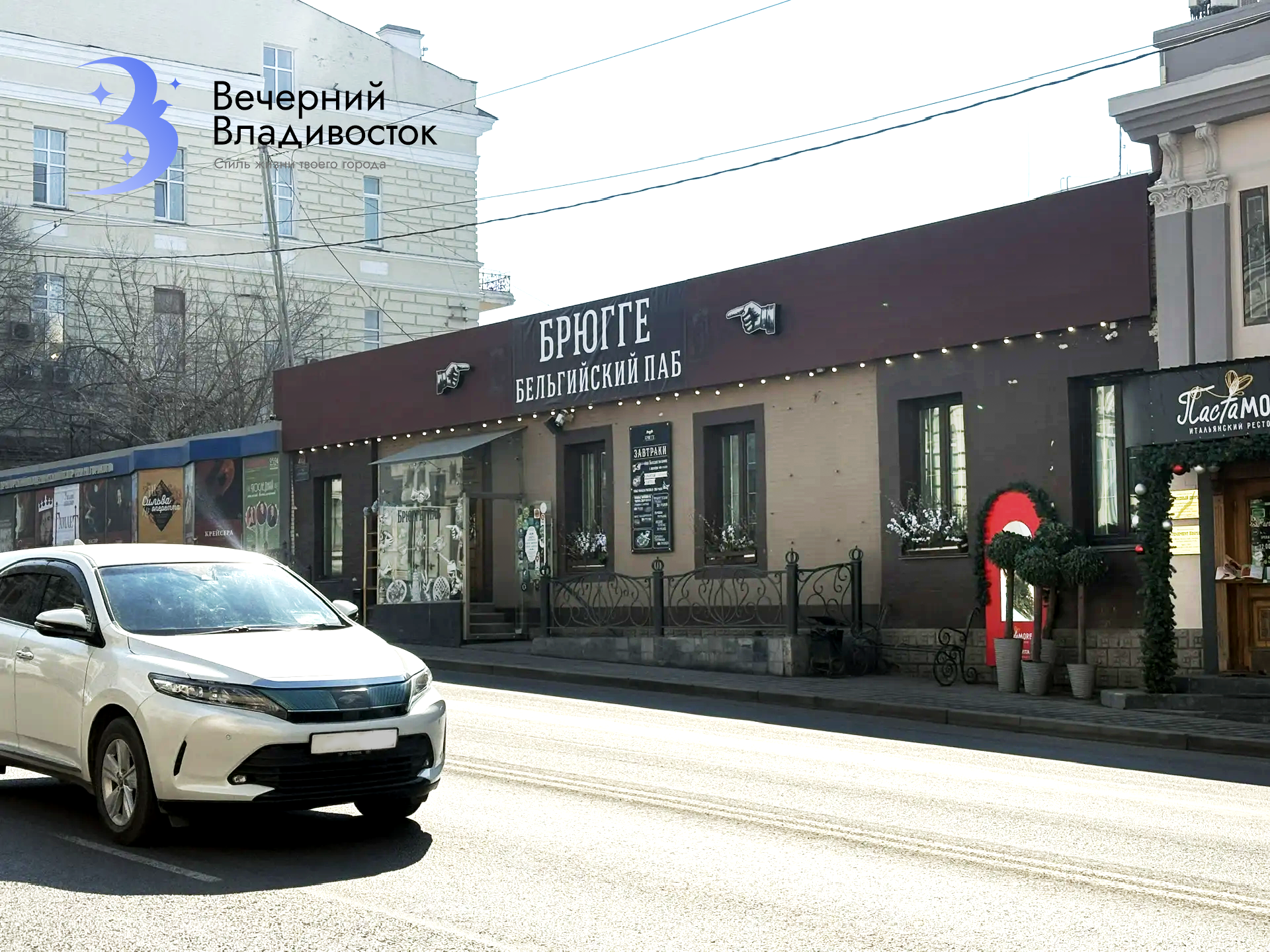 На Светланской сразу бросается большая надпись «Брюгге» вместо Brugge. Рядышком пристроилась «ПастаМоре», совсем недавно бывшая PastaMore. Видно, что вывески совсем новые и, очевидно, временные, так как на фоне старой подложки хорошо видны швы свежих баннеров. В данном случае ресторанам не пришлось особо думать над заменой названий – это имена собственные или придуманные, которые одинаково хорошо смотрятся и на кириллице, и на латинице.