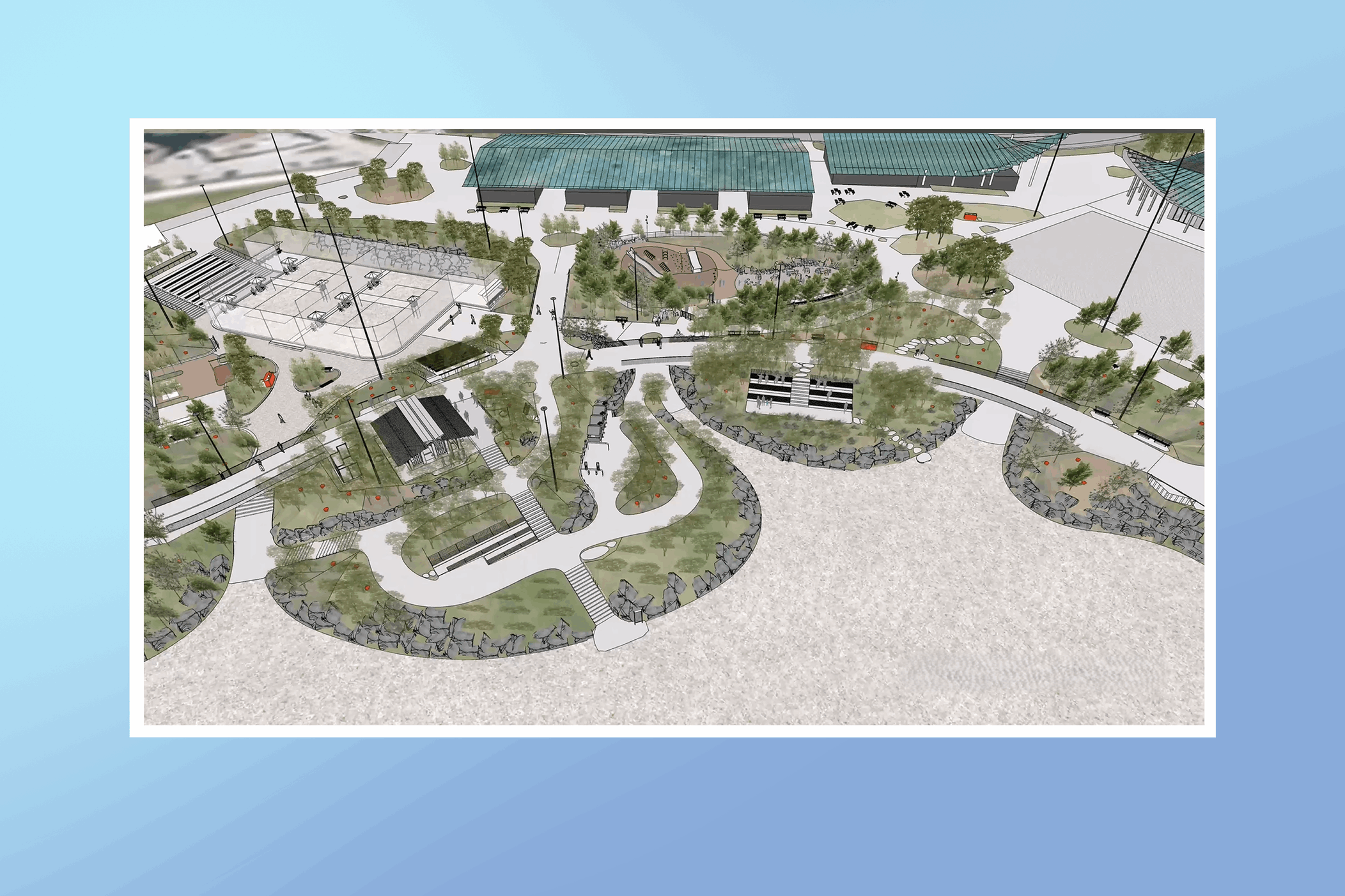 Кроме того, проект предусматривает возведение огромной сцены, которая, станет центром проведения городских мероприятий, фестивалей и концертов в летний период. Не менее важной частью плана стало обустройство обширной прогулочной парковой зоны, оснащенной местами для тихого отдыха.