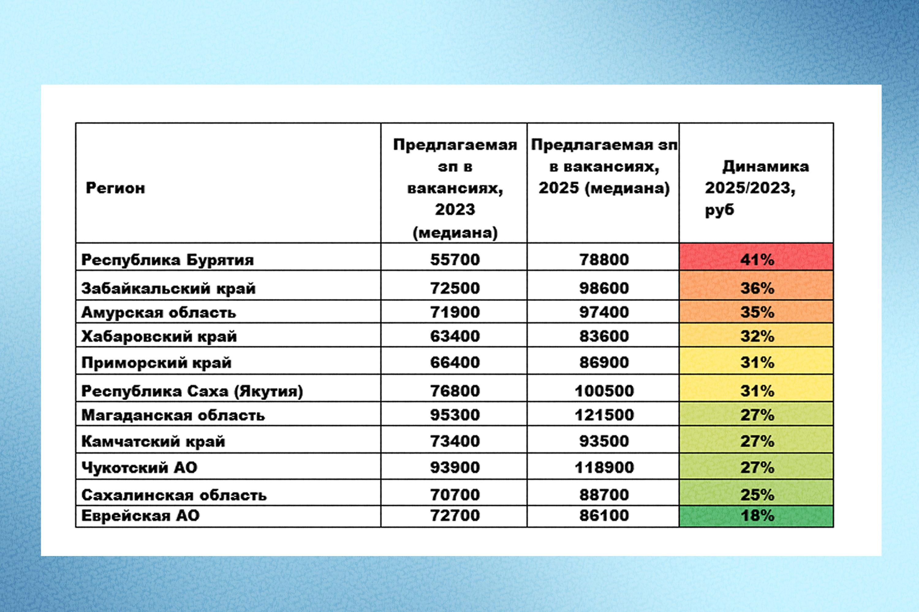 Согласно отчету, лидером по приросту зарплатных предложений стала Республика Бурятия, где медианная зарплата выросла на 41%. За ней следуют Забайкальский край (+36%) и Амурская область (+35%). Примечательно, что именно в этих регионах с высокой долей вахтового метода работы предлагаются и наиболее конкурентные суммы: в 2025 году медианное предложение в Бурятии достигло 78 800 рублей, в Забайкалье – 98 600, в Амурской области – 97 400 рублей.