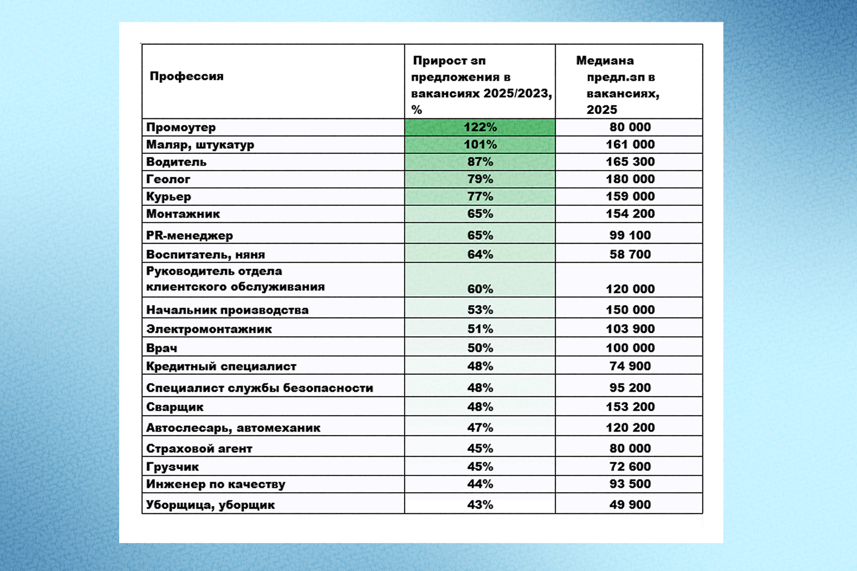 В топ-20 профессий с максимальным приростом вошли преимущественно представители реального сектора: водители (+87%), геологи (+79%), сварщики (+48%), электромонтажники (+51%). Это указывает на устойчивый дефицит квалифицированных рабочих рук и высокий спрос на строительные, логистические и инженерные специальности в рамках развития дальневосточной инфраструктуры.
