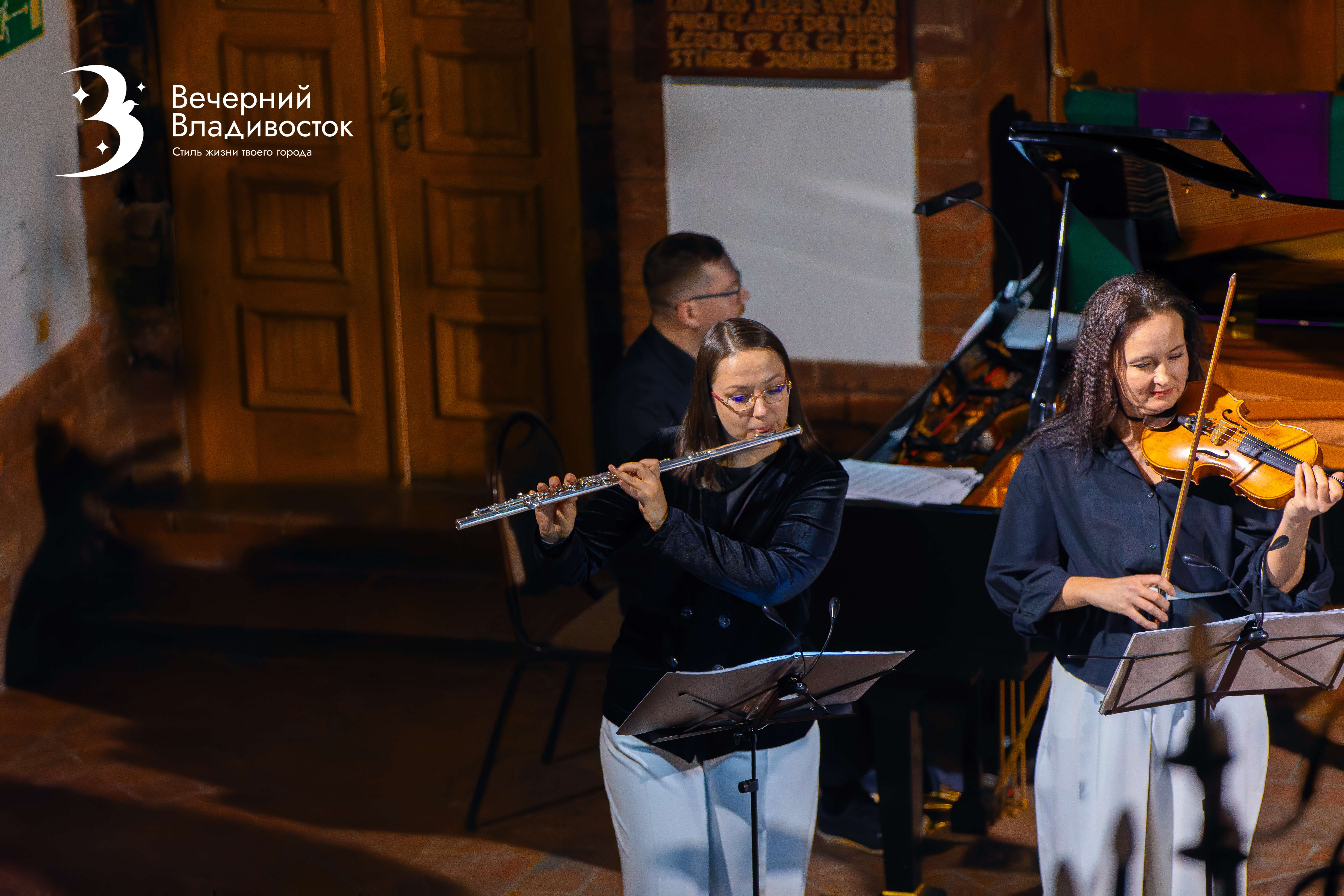 Константин Машицкий (виолончель) в этот вечер взял на себя роль шутника, очаровывая харизмой каждого слушателя. Флейтистка Елена Королева танцевала в такт музыке, то и дело переглядываясь, обмениваясь искрящимися улыбками со скрипачкой и концертмейстером Еленой Романовой.