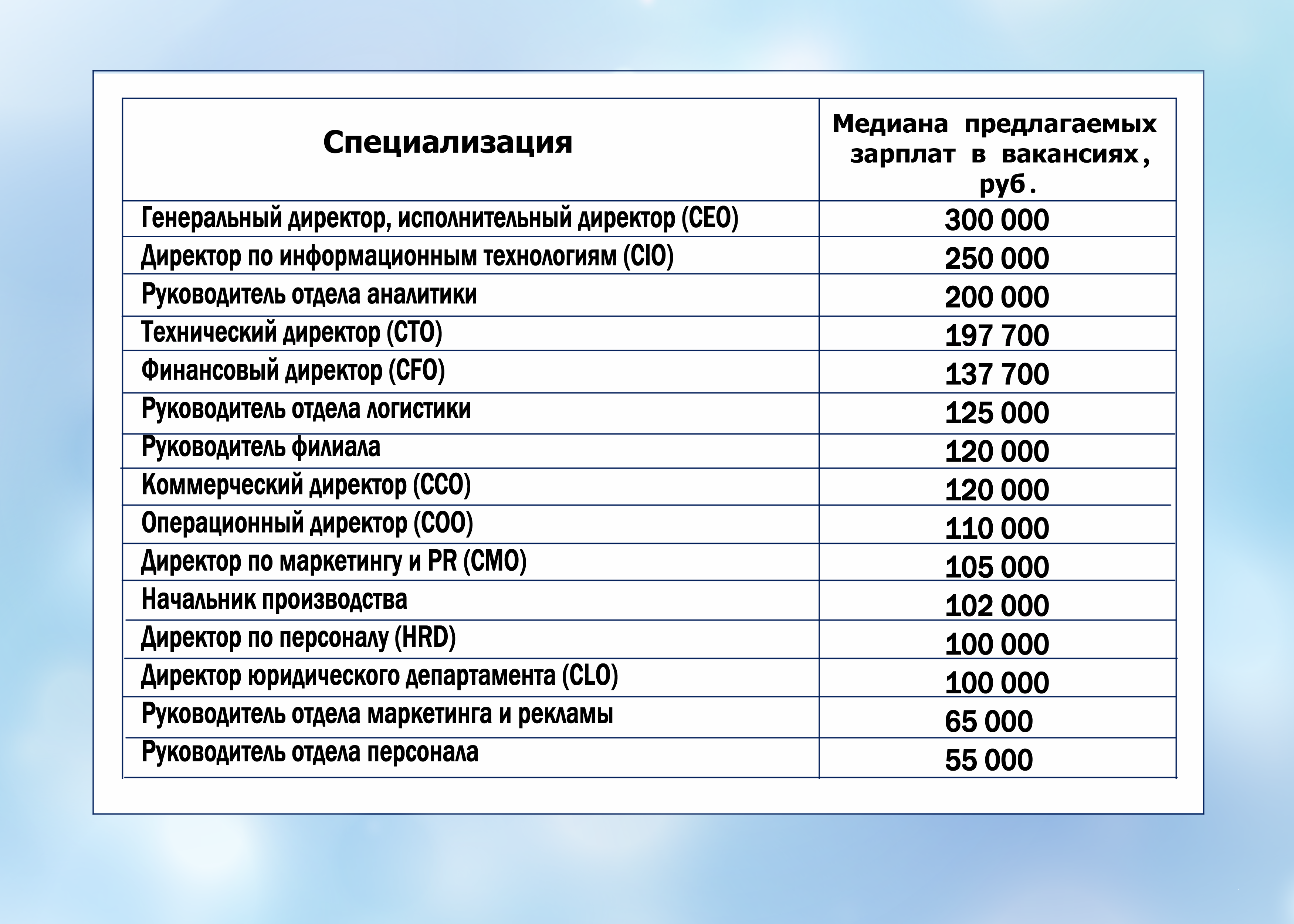 Интересно, что директора по маркетингу и PR (CMO) уступают «технарям»: их медианная зарплата составляет 105 тысяч рублей. Замыкают рейтинг руководители отделов персонала – 55 тысяч рублей, и отделов маркетинга и рекламы – 65 тысяч рублей, что заметно ниже средних зарплат топ-менеджмента.